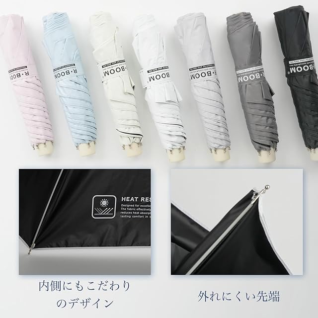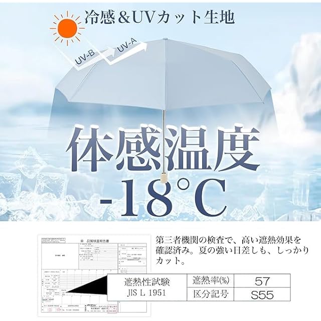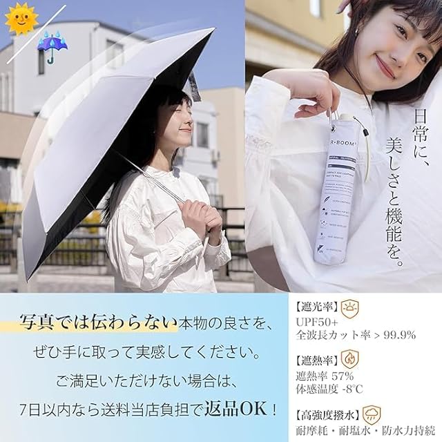 ③ 遮熱加工で体感温度-18℃!熱中症対策にも最適 裏面に特殊な遮熱コーティングを施し、直射日光の熱をしっかりブロック。炎天下でも傘の下はひんやり涼しく、体感温度は最大-18℃を実現。夏のお出かけが快適に。