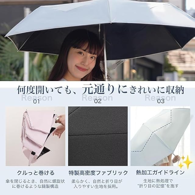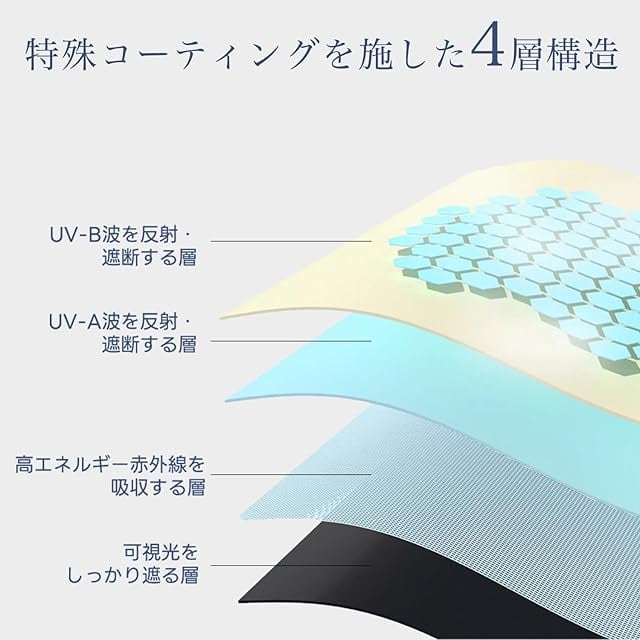 ① 完全遮光&UVカット100%で徹底紫外線対策 高密度の遮光生地を採用し、紫外線を100%カット。日焼け防止はもちろん、肌の老化を防ぎ、シミ・そばかす対策にも効果的。強い日差しの中でも安心して外出できます。