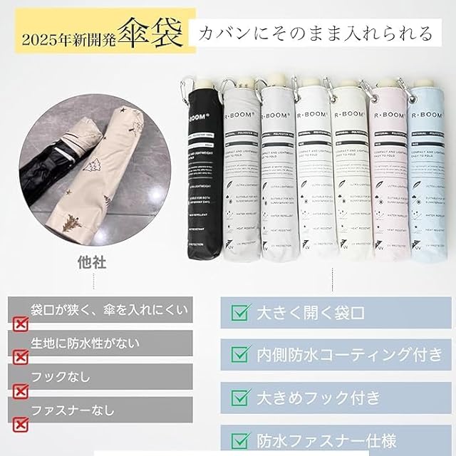 ⑤ 便利なフック付き防水傘カバー付き 付属の傘カバーには防水ファスナーとフック付きデザインを採用。濡れた傘もスマートに収納でき、バッグやリュックに引っ掛けて持ち運べるので紛失防止にも役立ちます。