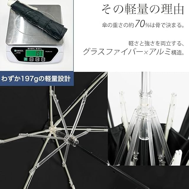④ 耐風構造&撥水素材で突然の雨も安心 6本骨構造にグラスファイバー×アルミ素材を採用し、軽量ながらも高い耐久性と柔軟性を両立。強風にもしなやかに対応し、撥水加工で雨の日も水をしっかり弾きます。