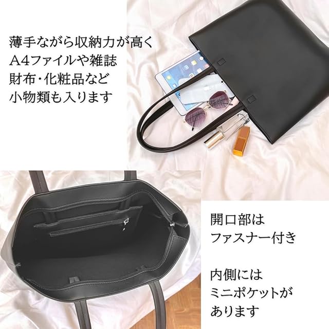 軽くてシンプルなデザインのオンオフ兼用トートバッグです。薄手ながらA4ファイルやタブレットなども入る高い収納力で、ビジネスバッグやスクールバッグとしても十分に使用できます。通勤や通学時の混雑する中でも移動しやすく手軽に持ち運びができます。<br><br> 軽量なので、手持ち・肘掛けでも腕にかかる負担が少なく長時間の使用でも疲れません。持ち手部分は長めになっており、トートバッグとショルダーバッグの2way使用が出来ます。開口部はファスナーが付いているので、閉めれば中身を見られる心配もなく防犯上も安心です。<br><br> 高品質の軽量素材でできたレザー生地を使用しているので、とても軽いうえに耐久性があります。肌触りは柔らかく弾力があり、熱や変形に強く丈夫な材質です。<br><br> カジュアル性も兼ねたシンプルなデザインは、ビジネス以外でもショッピングやプライべートなどあらゆるシーンで違和感なく使用できます。ブラック色は面接バッグや就活バッグ・リクルートバッグとして、また研修や法事等かしこまったシーンにも最適です。<br><br> 【バッグサイズ】:高さ27.5×横37×幅6cm 【持ち手】:25cm 【重量】:380g 【生地】: PUレザー 【開口部】:ファスナー 【ポケット】:内側ポケット×1