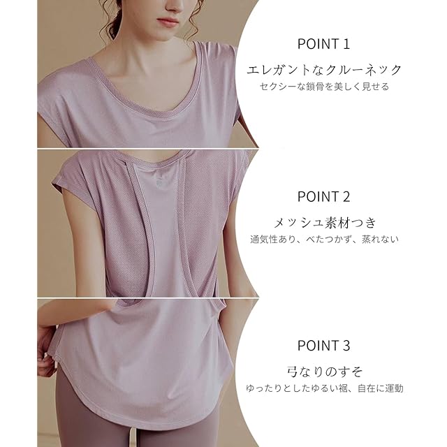 【美シルエット】動きやすく気になる部分をカバーしてくれるスポーツTシャツ。クルーネックであり、かた、くびの曲線美を形成し、弓なりの裾であり、ウエストとヒップのよい比率を演出します。スポーツと美しさを融合しています。