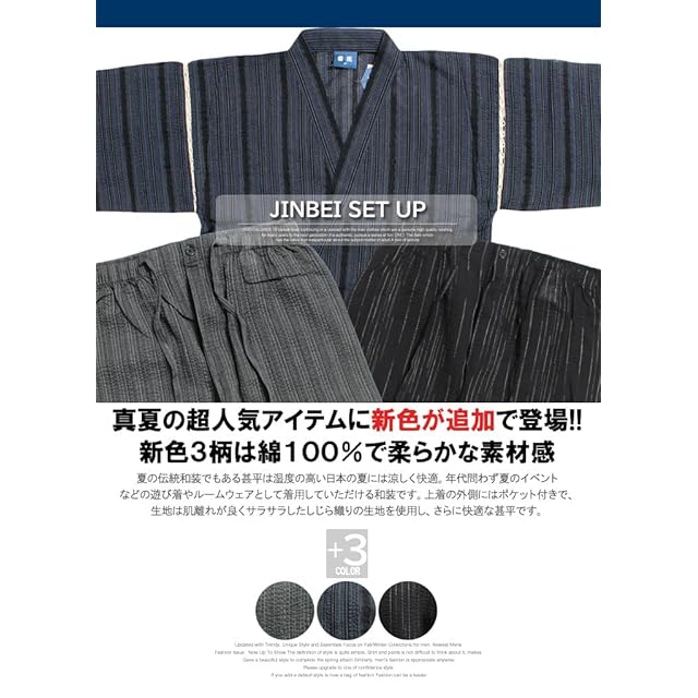 しじら織り甚平の登場です。<br>夏の伝統和装でもある甚平は湿度の高い日本の夏には涼しく快適。<br>年代問わず夏のイベントなどの遊び着やルームウェアとして着用していただける和装です。<br>上着の外側にはポケット付きで、生地は肌離れが良くサラサラしたしじら織りの生地を使用し、さらに快適な甚平です。サマーシーズンをより快適に、より楽しくお過ごし頂けるオススメのしじら織り縞模様甚平上下セットです。<br><br>素材:ポリエステル65% 綿35% やや透け感あり<br>Mサイズ:着丈77cm 身幅59cm 袖丈30.5cm タグ表記ウエスト76〜84cm 股上33cm 股下28m わたり31.5cm 裾幅30cm <br>Lサイズ:着丈80cm 身幅62cm 袖丈32cm タグ表記ウエスト84〜94cm 股上34cm 股下29cm わたり32.5cm 裾幅31cm <br>LLサイズ:着丈83cm 身幅65cm 袖丈33.5cm タグ表記ウエスト94〜104cm 股上35cm 股下30cm わたり33.5cm 裾幅32cm <br>3Lサイズ:着丈86cm 身幅71cm 袖丈32cm タグ表記ウエスト102~112cm 股上36cm 股下31cm わたり38cm 裾幅34cm <br>4Lサイズ:着丈87.5cm 身幅74cm 袖丈33cm タグ表記ウエスト110~120cm 股上37cm 股下32cm わたり39cm 裾幅35cm <br>5Lサイズ:着丈89cm 身幅77cm 袖丈33cm タグ表記ウエスト118~128cm 股上40cm 股下33cm わたり40cm 裾幅36cm<br><br>ブラック(4)、グレー(1)、ネイビー(3)は下記のスペックになります。<br>素材:綿100% しじら織り<br>Mサイズ:着丈74cm 身幅58cm 袖丈29.5cm ウエスト108cm 股下31cm ヒップ114cm<br>Lサイズ:着丈77cm 身幅60cm 袖丈30.5cm ウエスト112cm 股下32cm ヒップ118cm<br>LLサイズ:着丈80cm 身幅62cm 袖丈31.5cm ウエスト116cm 股下33cm ヒップ122cm<br>3Lサイズ:着丈85cm 身幅71cm 袖丈32cm ウエスト118cm 股下32cm ヒップ126cm<br>4Lサイズ:着丈88cm 身幅74cm 袖丈33cm ウエスト124cm 股下33cm ヒップ132cm<br>5Lサイズ:着丈90cm 身幅77cm 袖丈33cm ウエスト130cm 股下33cm ヒップ138cm