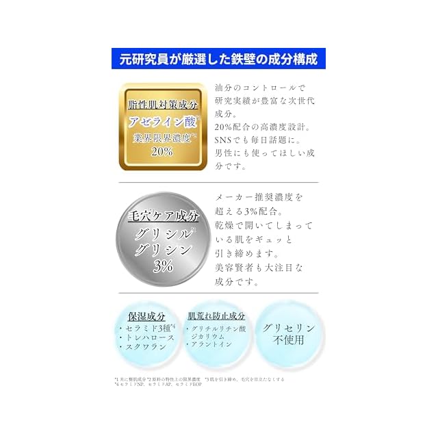 元大手化粧品メーカーの研究員が独立して、2年の歳月をかけて完成させた驚愕毛穴*ケア「アゼライン酸20%クリーム」です。 アゼライン酸が20%と高濃度なだけではなく、グリシルグリシンも3%というW高濃度が業界で話題沸騰中。 W処方で毛穴*に効率的にアプローチします。 保湿成分や肌トラブル防止成分もしっかり配合。 グリセリンフリーでサラッとべたつかないテクスチャーは他には真似できません。 7種類の無添加と日本人でのパッチテストで多くの方に使っていただける設計にしています。 *肌を引き締め、毛穴を目立たなくする