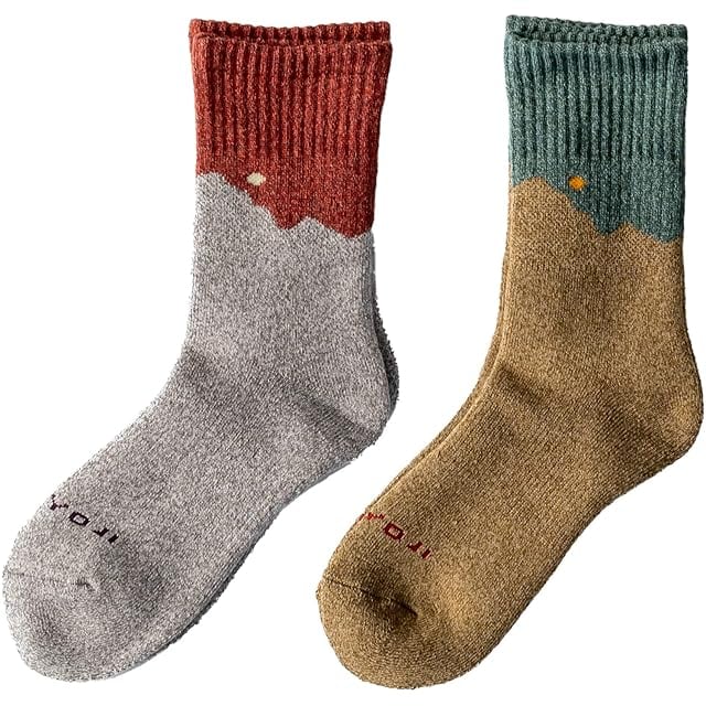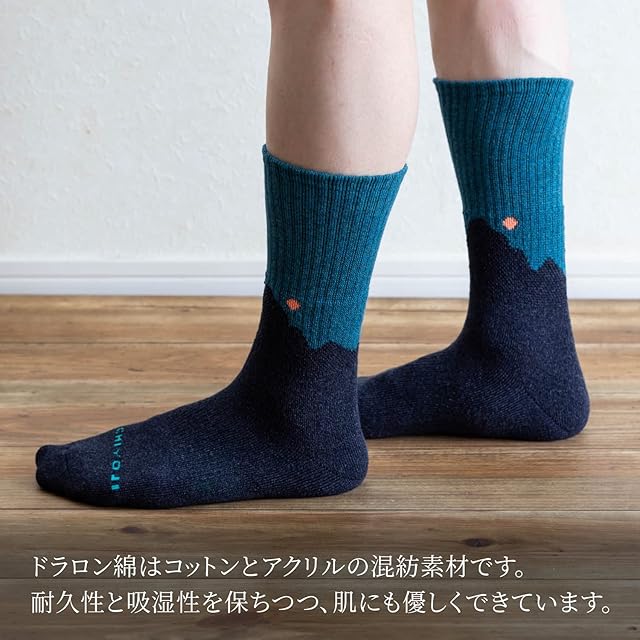 ドラロン綿を使用した日本製のトレッキングソックス。<br> ハイキングやウォーキング、アウトドア、スポーツに最適。<br> 普段履きにもおしゃれに履いていただけます。<br> 全パイルで厚みのある生地が、足を衝撃から守ります。<br><br> ドラロン綿はコットンとアクリルの混紡素材です。<br> 高い耐久性・吸湿性と、コットンの柔らかな履き心地を両立しています。<br><br> 千代治のくつ下の工場は、播磨の名峰、高御位山(たかみくらやま)の麓にあります。<br> 高御位山は山頂からの見晴らしが良く、美しい初日の出が見られることで有名です。<br> この靴下は、そんな高御座山の山影をモチーフにつくりました。<br> 千代治のくつ下のアトリエと、高御座山から登る太陽をイメージして、ワンポイントの編み込みを入れています。<br> つま先には「CHIYOJI」の刺繍が入っています。