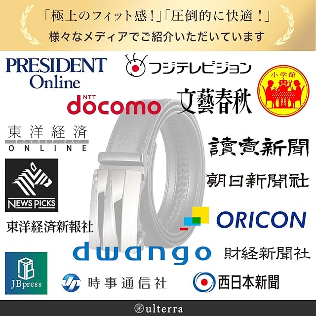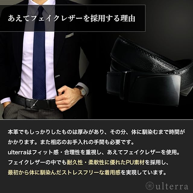 ulterra(ウルテラ)よりフォーマルやカジュアル、ゴルフなどのスポーツシーンはもちろん、仕事用のベルトとしてビジネスにも着用頂けるオートロックベルトが登場しました。<br> 紳士用ベルトの弱点の一つがベルト穴の劣化ですが、このベルトは穴なしの無段階調整ベルトのスタイルを採用。<br> 従来の穴ありのメンズベルトに比べて、この紳士ベルトはより細かく柔軟な長さ調整が可能で、ご自身の体型に常にベストなサイズかつ、サイズ調節も簡単にご利用頂けます。<br> 本体に使用している合成皮革は肉厚でスレや傷に強く、それでいて柔らかく、柔軟性があり、体にフィット。学生から大人の社会人、シニアの方などあらゆる世代の男性にお使いいただけます。<br> ベルトのバリエーションもバックルごとに豊富なスタイルを揃えており、長さも120cmと大きめで体型を選びません。ulterra(ウルテラ)オリジナルのギフトボックスも付属するので、父の日や誕生日などのプレゼントにもおすすめのメンズベルトです。<br><br> 【サイズ・素材】<br> サイズ:長さ…約120cm 幅…3.5cm <br> 素材:PUレザー(合成皮革)