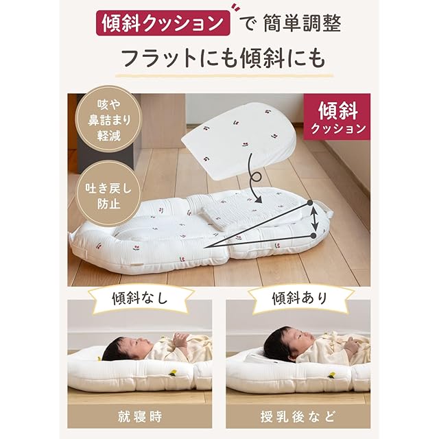 【吐き戻し防止クッション付き】30°のゆるやかな傾斜クッションを赤ちゃんの頭部分に置けば背中が丸まり、赤ちゃんにとって呼吸がしやすい姿勢をキープできます。咳や鼻づまりを軽減し、ミルクの消化にもいい体勢なので吐き戻し防止にもおすすめです。ねんねのときはクッションを外してフラットな状態でご使用ください。