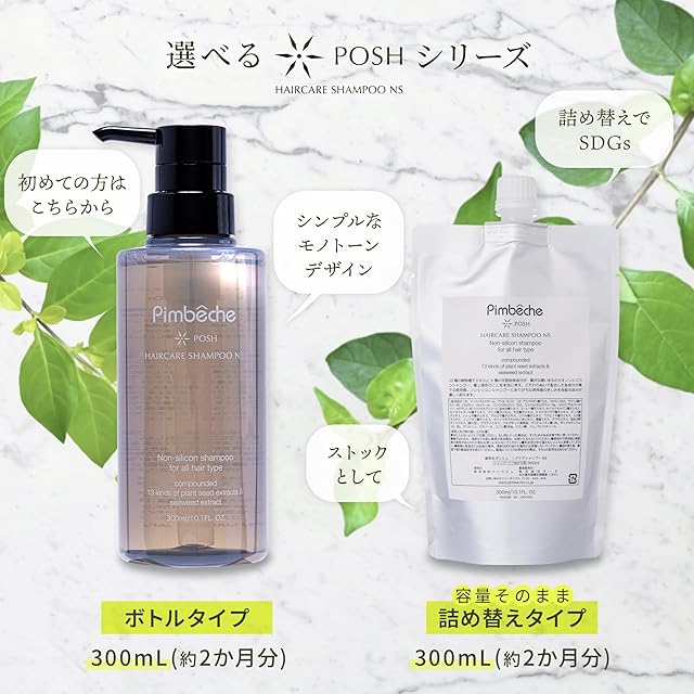 ポッシュ ヘアケアシャンプーNSは、アミノ酸系の良活性剤を使用した低刺激のアミノ酸ノンシリコンシャンプーです。シャンプー1本で美髪ケア&頭皮ケアを行えるスカルプシャンプーです。<br>13種の植物種子エキス、5種のスカルプ成分が髪の芯まで保湿し、ノンシリコンシャンプーにありがちな洗い上がりのきしみ感を感じません。<br>シーネイチャーエキス、ランドネーチャーエキスが毛のメカニズムにアプローチ。<br>もちろん 無鉱物油、無着色、無表示指定成分で背中の皮膚が気になるという方にもお勧めです。<br>2つの国産スカルプ成分が 頭皮環境の乱れの原因である「頭皮の乾燥」と「過剰皮脂分泌」にアプローチし、頭皮と髪のコンディションを整えハリとこしのある髪へ導きます。 スカルプ成分①「黒寿仙」 黒寿仙は兵庫県の丹波篠山産の高級黒豆。女性に嬉しいイソフラボンと良質なタンパク質が豊富に含まれています。 スカルプ成分②「R-021」 R-21はモウソウチクのタケノコの皮から抽出したエキスです。栄養成分が豊富で髪の毛を構成するにアミノ酸が多く含まれています。 13種の植物種子エキスが皮脂を抑えながらも保湿し頭皮環境を整えます。
