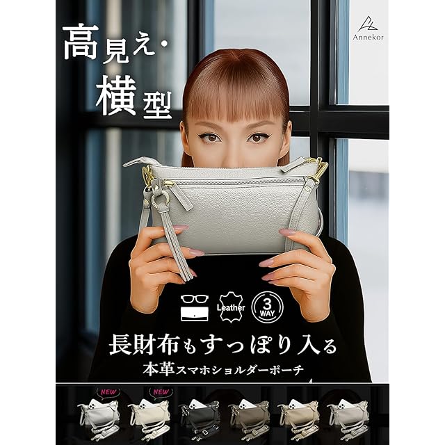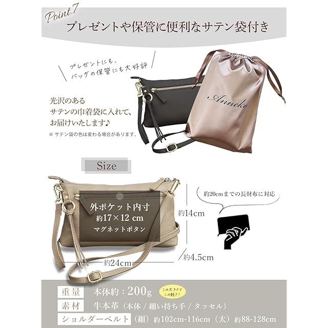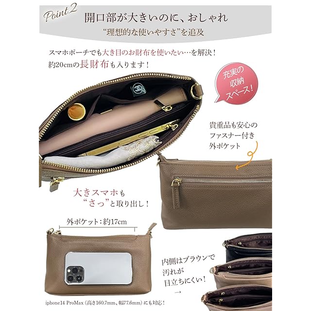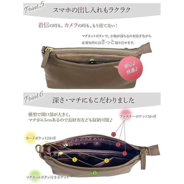 ✅【使いやすいサイズの本革スマホショルダー】上質なシュリンクレザーを使った便利な横型スマホショルダーポーチが登場、丈夫でキズ・汚れがつきにくく、シンプルなデザインの中に詰め込まれた高機能が特徴です。すぐに劣化してしまうフェイクレザー(PUレザー)とは全く違った高級感で永くご利用いただける本革素材です。【サイズ】縦140㎜/横240mm/マチ45mm <BR> ✅【コンパクトながら長財布も入る!】ちょっとした時にサッと斜め掛けでお出掛け。わずか200gのポーチは邪魔にならずお子様連れやお仕事時も両手を使う事ができ便利です。メインスペースは、真ん中に貴重品などを入れるファスナーポケットがあり、コンパクトながら横幅20㎝程度の長財布も収納できる設計をした優れものです。<BR> ✅【大きめのスマホも収納OK】外側両側にあるポケットは片方が取り出しやすいマグネット式、もう片方はファスナー式とお好みによってお選びいただく事が出来、どちらも大きなサイズのiPhone14ProMaxまでも入るサイズとなっております。 「コンパクトすぎてスマホの出し入れが難しい」という事が無いよう、数十種類のスマホで実調査をしてポケットサイズを「スマホの出し入れがちょうどよい大きさ」に仕上げました。<BR> ✅【2種類のストラップ付】手によく馴染む本革のストラップは、長時間肩掛けしていても違和感がありません。控えめなゴール後の金具がアクセントのストラップは100-120cmの長さで調整が可能で使いやすさ抜群です。また、シーンにあわせてご利用いただけるナイロンベルトもお付けしており、2種類のベルトを使い分けいただけます。<BR> ✅【類似品にご注意ください。お買い物は日本企業で】見た目の画像は同じような商品でも、作る工場や品質・対応は全く違います。すぐに壊れる・色が画像と違う・連絡をしても返事がない等色々なトラブルがございますので、販売業者は慎重にお選びくださいませ。日本企業でのお買い物はアフターケアも充実。何かございましたら、弊社日本人スタッフが迅速に対応させていただきます。