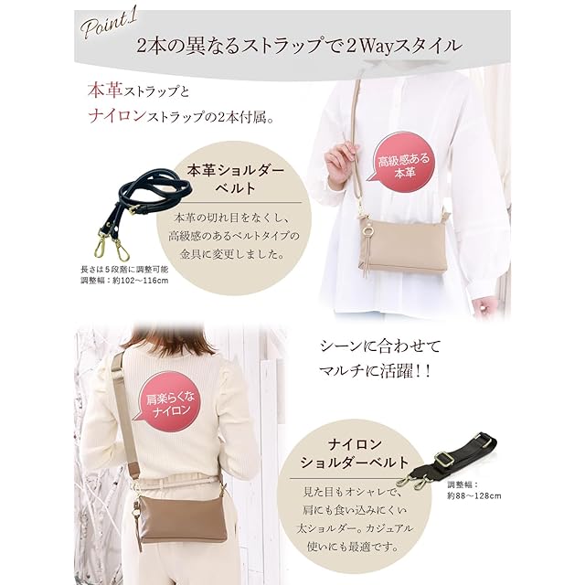 ✅✅✅✅【2種類のストラップ付】手によく馴染む本革のストラップは、長時間肩掛けしていても違和感がありません。控えめなゴール後の金具がアクセントのストラップは100-120cmの長さで調整が可能で使いやすさ抜群です。また、シーンにあわせてご利用いただけるナイロンベルトもお付けしており、2種類のベルトを使い分けいただけます。
