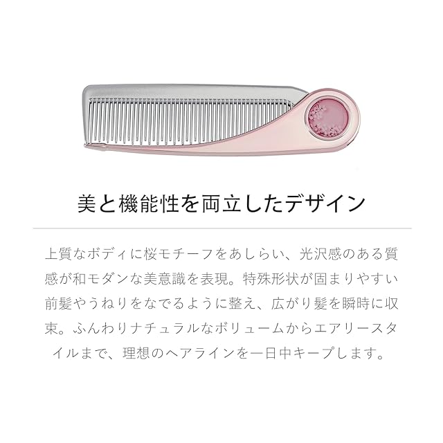 【洗練されたデザイン】桜の花モチーフが施された光沢感あるボディに、シンプルなラインと繊細なテクスチャーが調和。モダンとクラシックの融合から生まれる高級感あふれるビジュアル。ロック機能付きで開いた際にしっかり固定され、スムーズに髪を梳かせます