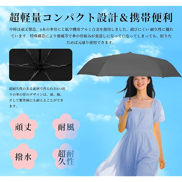 【頑丈&耐風&撥水&超耐久性】中棒は頑丈製造、6本の傘骨にと航空機用アルミ合金を使用しました。錆びにくい 耐久性に優れています。特殊構造により強風等で傘の骨組みが裏返しになってになってしまっても、折りたためば元通り使用できます。