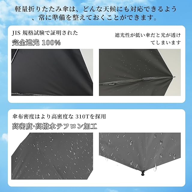 【超撥水性&晴雨兼用】本製品は214D超高密度のテフロンポリエステル材料を採用しします。片側には超撥水のテフロン加工も施されたので、優れた撥水性があり、軽く振るだけでほとんどの水滴が振り払えます。夏季でも秋季でも、超人気な超軽量の折りたたみ日傘です。強い風の日にも強い雨の日にも使われ、全天候対応できる便利な晴雨兼用の折りたたみ傘です。外出にぴったりの一品です。