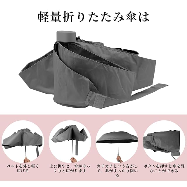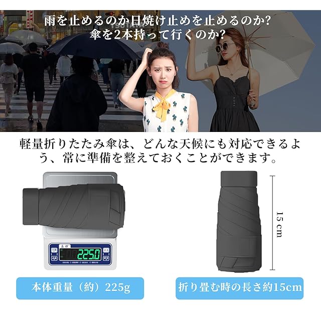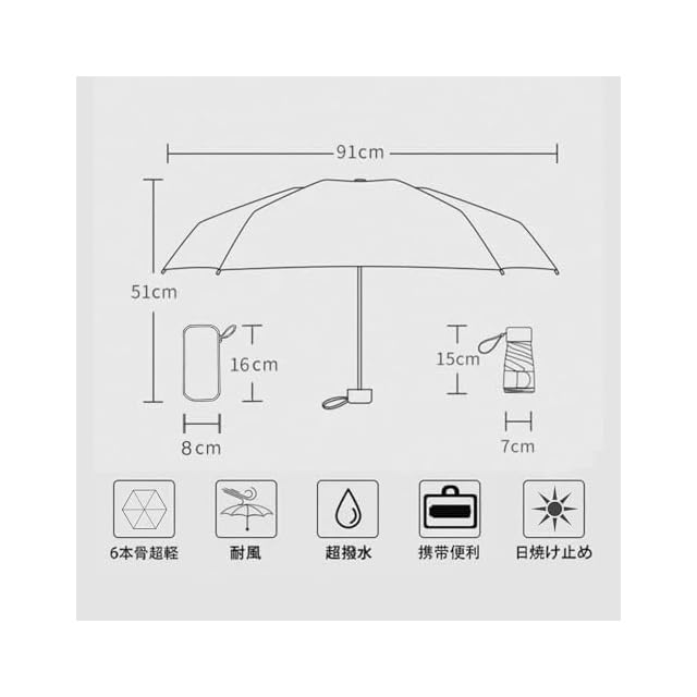 雨に負けず、頑張ってください。 紫外線を負担にさせない。<br>TVVTOの軽量折りたたみ傘は、どんな天候にも対応できるよう、常に準備を整えておくことができます。<br>超耐久性のある素材で作られた6つ折りの傘の骨のデザインは、雨、風、そして紫外線にも耐えることができます。<br>携帯用収納ケース付きで、持ち運びや収納も簡単です。<br>大人も子供も使えるこの傘は、アウトドアの必需品です。<br>悪天候に負けず、TVVTOの折りたたみ傘を持ち歩き、安全で快適な生活を送りましょう。<br>TVVTOの折りたたみ傘は、旅先でもあなたを守ります!<br> <br>製品仕様:<br> 【本体重量(約)】250g<br> 【ボタン】樹脂<br> 【傘面】210T高密度<br> 【テフロン撥水加工】あり<br> 【傘骨】ガラスファイバー+アルミニウム合金製<br> 【ハンドル】ABS樹脂<br> 【折り畳む時の長さ】約15cm<br> 【開いた直径】約95cm<br> 持ち手:高質感ABS樹脂<br> 二、 TVVTOの軽量折りたたみ傘は、どんな天候にも対応可能な晴雨兼用タイプです。さらに紫外線遮断機能が付いているため、晴れた日にも安心して使用できます。また、大人と学生に最適なデザインで、すっきりとしたおしゃれなデザインが特徴的です。 <br>さらに小型で、収納ポーチも付いているため、持ち運びがとても便利です。バッグやカバンに簡単に収納可能で、外出時に嵩張ることなく、いつでもどこでも使えます。 <br>風に強い高強度グラスファイバー製の骨構造が特徴で、風に負けずにしっかりとしています。耐風撥水機能も備えているため、突然の雨にも安心です。 <br> <br> 三、 TVVTOの軽量ポータブル折りたたみ傘は、通勤や学校、ショッピング、旅行など様々なシーンで活躍します。小型でありながらも強い耐久性を持ち、折りたたみやすいので、使用後もスムーズに収納できます。 <br>さらに、シンプルなデザインはビジネスシーンからカジュアルまで幅広く対応可能で、男女問わずにお使いいただけます。また収納ポーチ付きなので、持ち運びも手軽にでき、いつでもどこでも快適な日々を過ごすことができます。 <br>身につける小物としてもおしゃれな折りたたみ傘は、自分用はもちろん、プレゼントとしても最適です。一日の生活をより快適に、そしておしゃれに彩るTVVTOの折りたたみ傘をぜひご利用ください。
