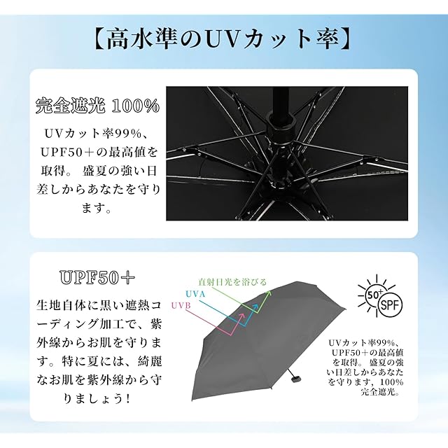 【高水準のUVカット率】 本製品日傘UVカット率100%、UPF50+の最高値を取得。 盛夏の強い日差しからあなたを守ります。100%完全遮光 ,生地自体に黒い遮熱コーディング加工で、紫外線からお肌を守ります。特に夏には、日差しは強くなくても紫外線は強いので、ぜひこの傘をお使い、綺麗なお肌を紫外線から守りましょう!
