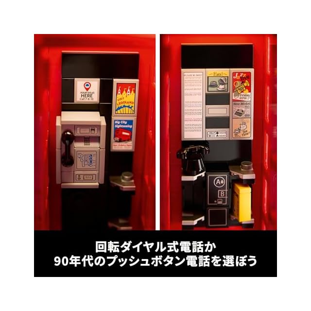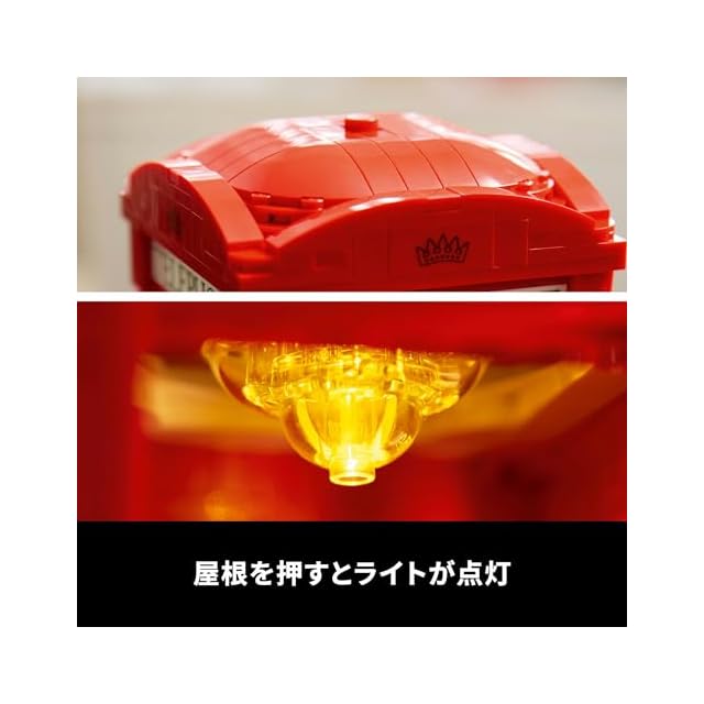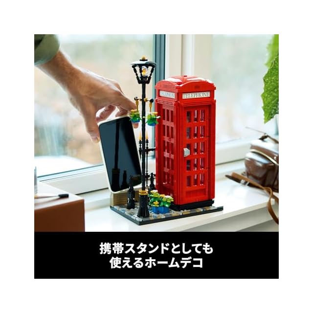 ご自宅やオフィスを飾るインテリア – 電話ボックスの屋根にあるボタンを押すとレゴライトブロックが光ります。フェンスは携帯スタンドとしてご使用いただけます
