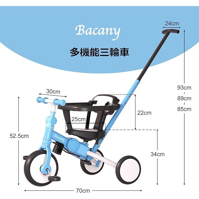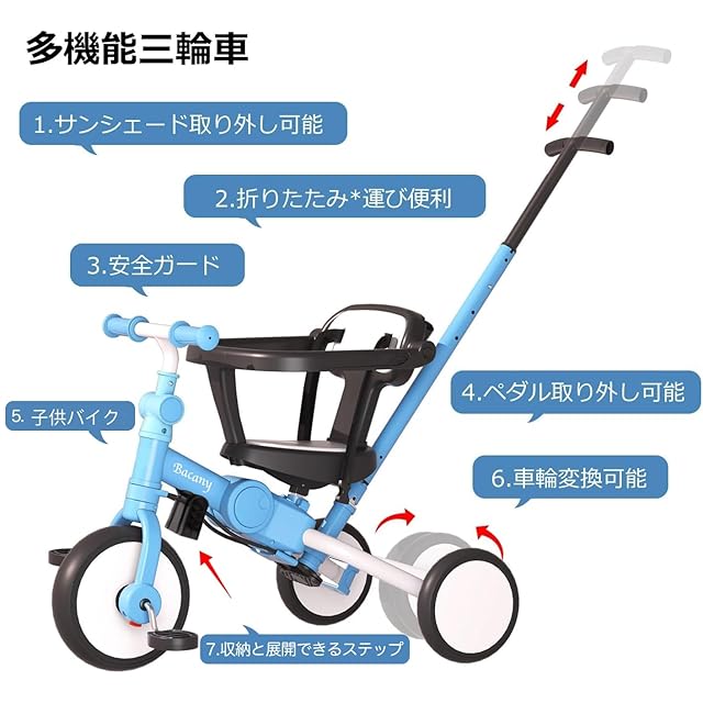 商品名:Bacany 子供用三輪車 7in1 三輪車 ステップ付き 折りたたみ 手押し棒 おしゃれ 1歳-6歳 ランニングバイク 子供バイク コンパクト 自転車 おもちゃ 乗用玩具 幼児用 キッズバイク プレゼント おもちゃ 調整可能 お祝い ギフト シートベルト付き (ブルー)
