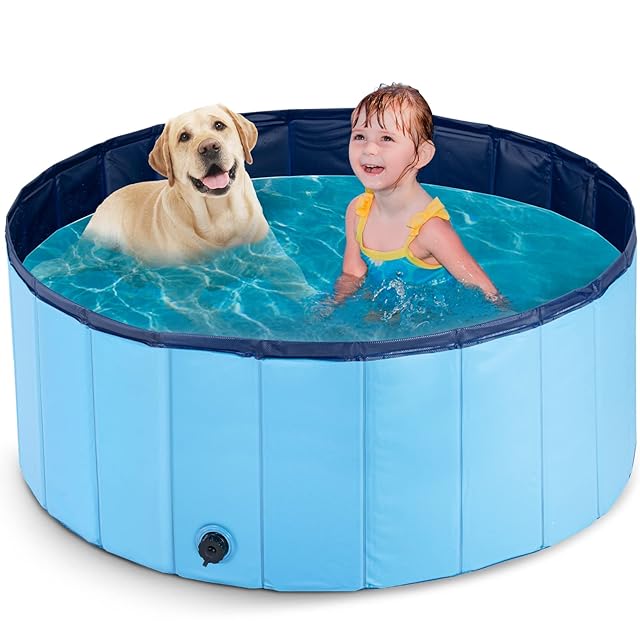 【型崩れしない犬用プール:】:環境にやさしいPVC材質で作られ、しかも、PVCの厚さは改良され、競争品より、もっと厚いです。とても頑丈で、破れにくいです。また、周りのボードは優れたPP材質で作られ、厚さは5mmで、従来品より壁を支える部分を厚くしたことでより良い安定、より長持ちです。子供はペットちゃんと一緒に水遊びも大丈夫です。