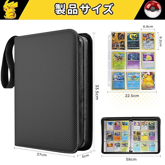 【サイズ&容量】カードファイル全体サイズ33.5x27x5cm、単一メッシュサイズ6.8x9.2cm、各ページ9ポケット、900枚収納可能、50枚入り。