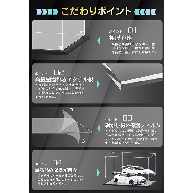 【見栄えアップ】高透明UVカットアクリル素材を使用、大切なコレクションを紫外線によるダメージから守ります。優れた耐久性と高い透明度を兼ね備えているため、ホコリやキズから守ると同時にコレクションをアクリル越しでもキレイに魅せます。