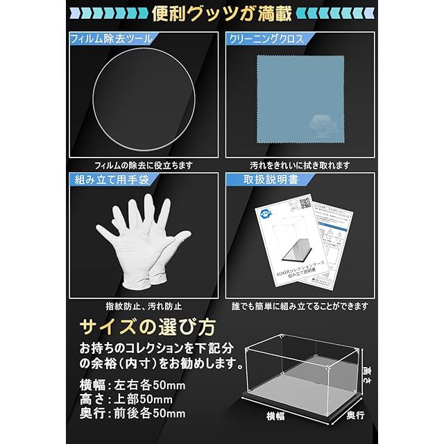 【組立簡単】固定ピンを押すだけの簡単取付、接着剤や工具は不要です。組み立て時に指紋や埃が付かないように手袋とクロスが付属、アクリル面をクリアに保つことが出来ます。アクリル板には剥がしやすい保護フィルムを採用、更にフィルム除去ツール付き。フィギュアケース全体を持ち上げても崩さない、展示物の出し入れが楽々。