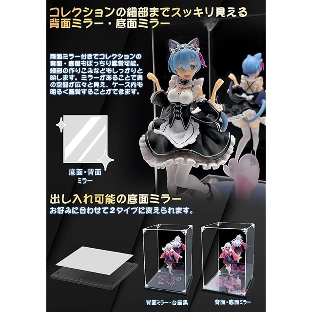 KUKERフィギュアケース アクリルケース UVカット コレクションケース ディスプレイケース 台座 背面ミラー 組み立て簡単 頑丈 汚れ防止 手袋 クリーニングクロス付き(30×20×20cm, 台座ミラー+背面ミラー) | Trend Design BASE店