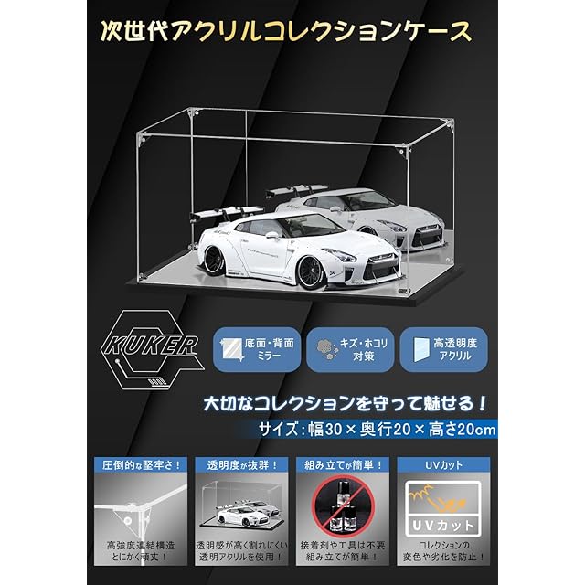商品名:KUKERフィギュアケース アクリルケース UVカット コレクションケース ディスプレイケース 台座 背面ミラー 組み立て簡単 頑丈 汚れ防止 手袋 クリーニングクロス付き(30×20×20cm, 台座ミラー+背面ミラー)