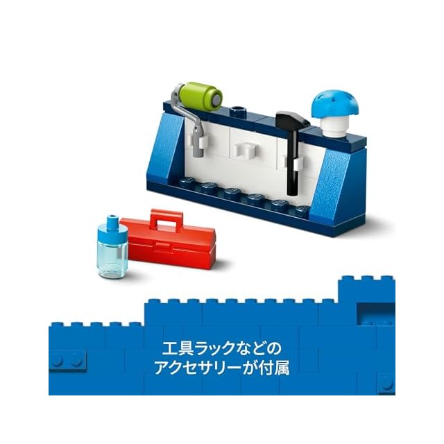 レゴミニフィギュアの各種アクセサリー – 車イス、優勝トロフィー、自撮り棒、工具棚と工具など、ごっこ遊びに役立つアイテムが付属
