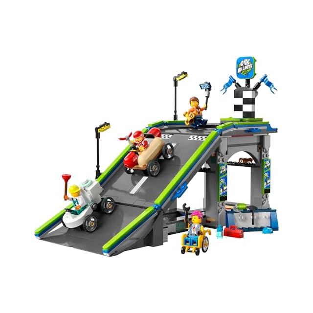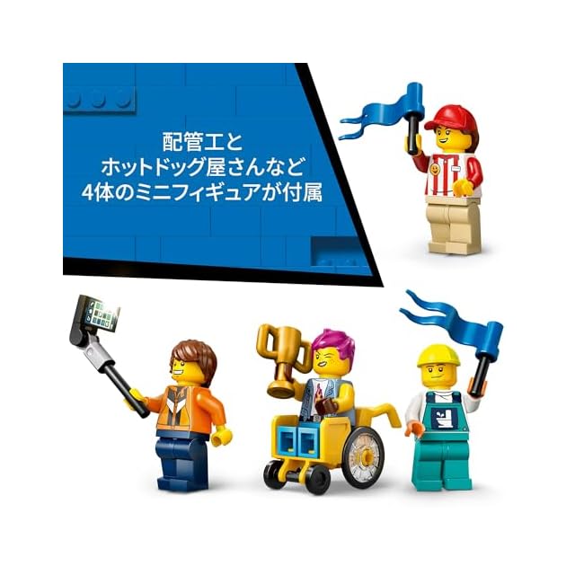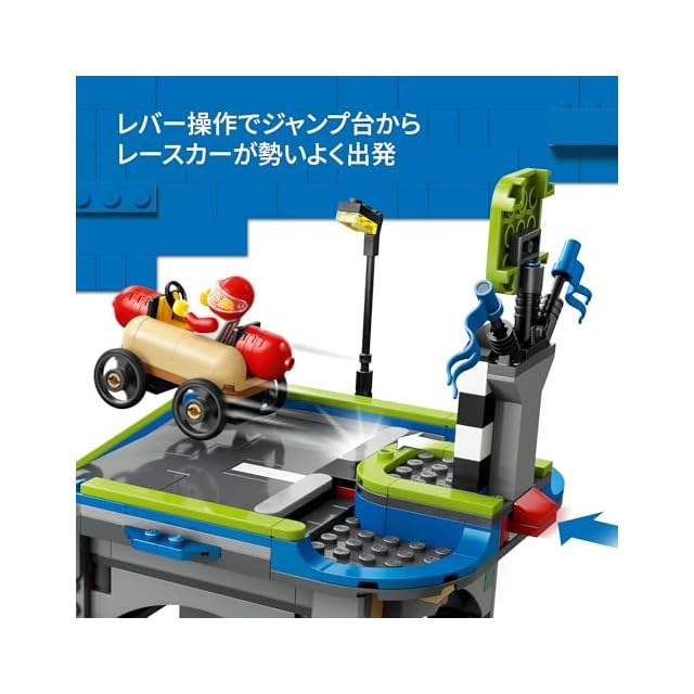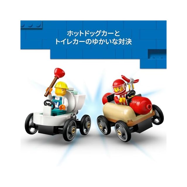 セットの内容 – ジャンプ台およびホットドッグとトイレのレースカーの組み立てに必要なパーツ、ホットドッグ屋店主と配管工を含むミニフィギュア4体