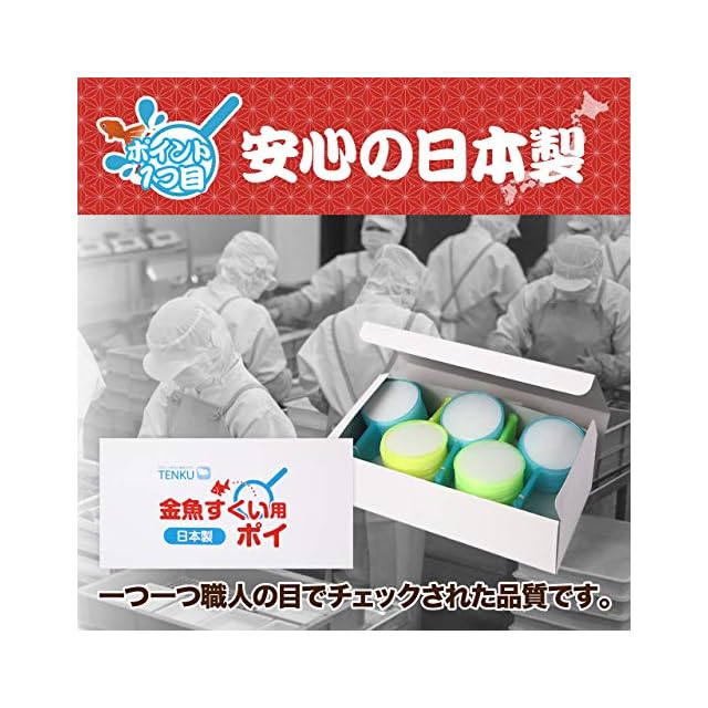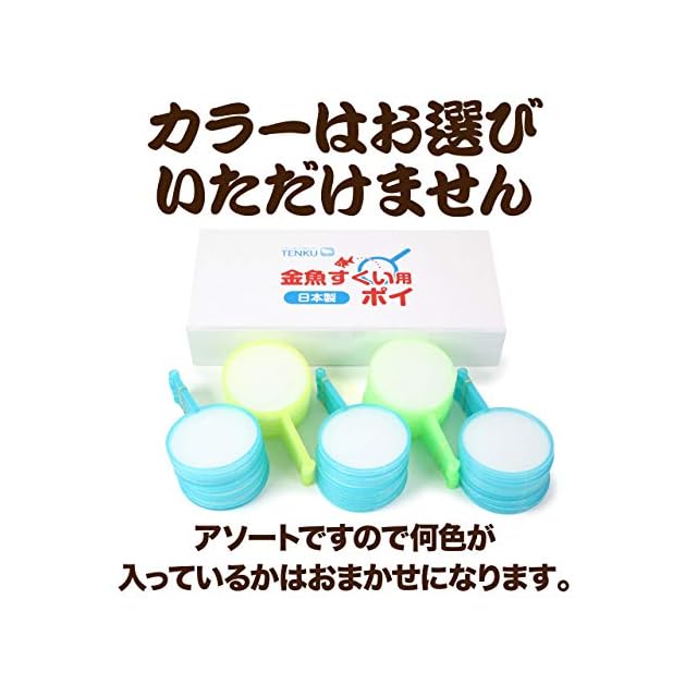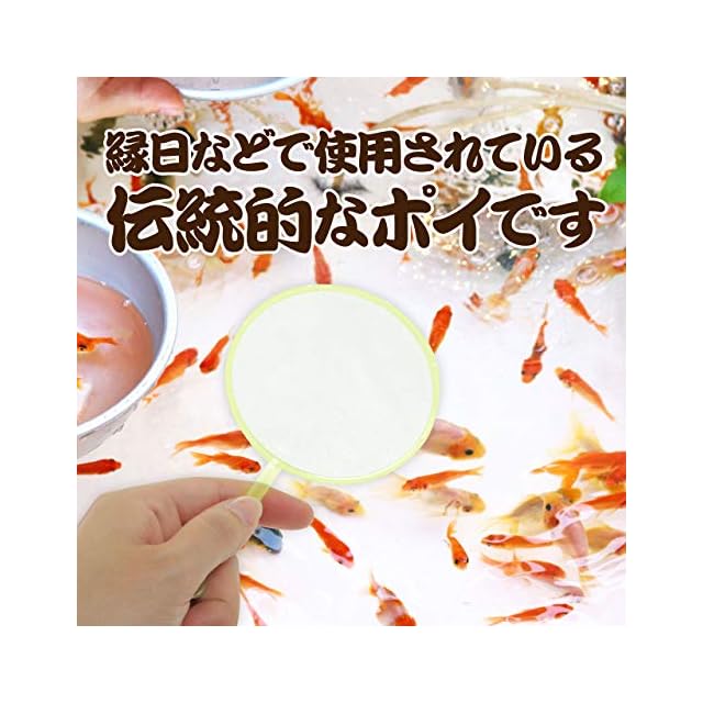 全国金魚すくい選手権大会で使用されているポイと同じで、高品質で安心の日本製。 縁日などの金魚すくいやスーパーボールすくい等で使用されている紙付き枠です。 縁日や夏祭り、子供会イベント、文化祭などで使うのに最適な手間のかからない業務用セットです。 【紙の強度】 強い 4号←5号←6号←7号 弱い 【目安】 ●金魚5号(5号はやや強めで、金魚すくい選手権大会でも使用されています。) ●メダカ7号 ●スーパーボール4号 ●子供向け4.5号 ●大人向け6.7号 【注意点】 ・ポイの色はアソートでご指定できません。 ・100本入りとありますが、業務用のため多少数量に誤差がある場合もありますが、この点も予めご了承お願いいたします。 ・ポイは紙が薄く、紙の剥がれや変色、破れ等が発生している場合もありますが、破損しやすい性質のものですので、何卒ご理解の程よろしくお願いいたします