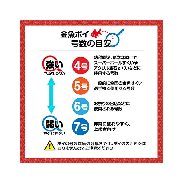 【紙の強度】強い 4号←5号←6号←7号 弱い 【目安】 ●金魚5号(5号はやや強めで、金魚すくい選手権大会でも使用されています。) ●メダカ7号 ●スーパーボール4号 ●子供向け4.5号 ●大人向け6.7号