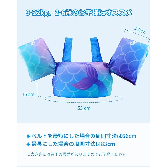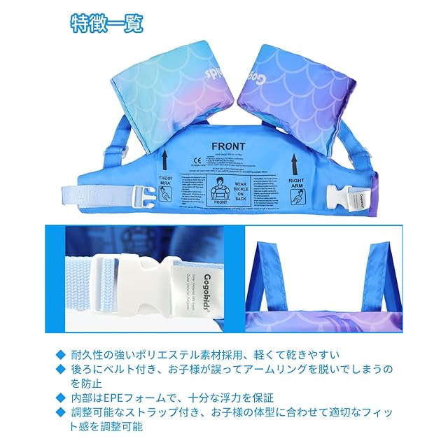 【使いやすさ】腕を通して、バックルで簡単に装着するだけです。お子様も嫌がらずにつけてもらえます。調節可能なストラップは、9〜22㎏のお子様に適切な浮力サポートを提供します。