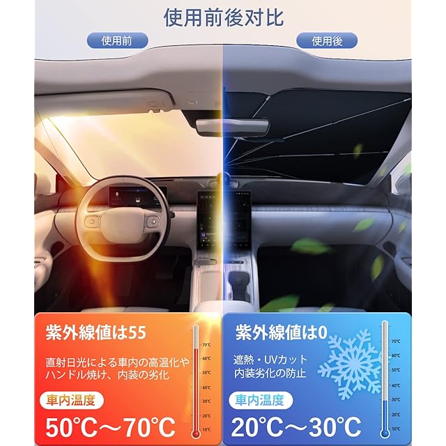 【適用車種・他の用途】4サイズ選択可能で99%の車のフロントガラスに対応できます。軽自動車、ビジネス車、SUV、MPVなどの中大型車もコンパクトカー、スポーツカーなどの小型車も使用できます。本製品は車のフロントガラスの日よけとして利用できる他に、屋外の日よけとしても使用できるため、強い紫外線から肌を守り、雨が降った時でも傘としても使えます。プライバシ保護として、車泊の時にも活躍します