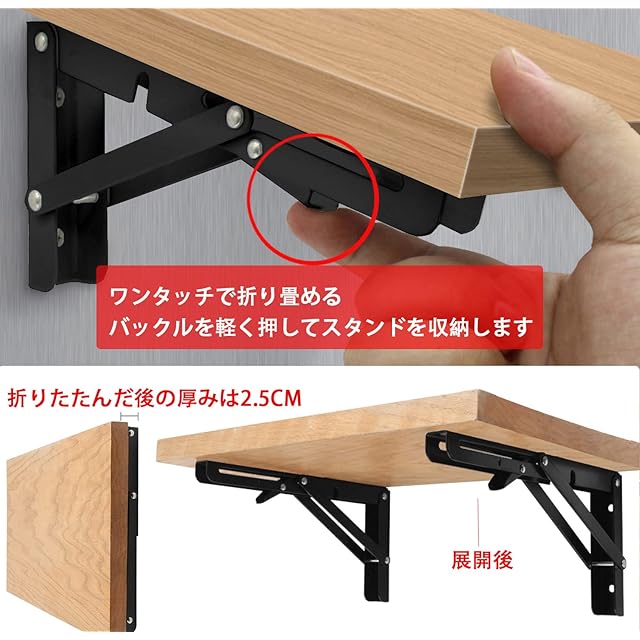 【便利な折りたたみ収納棚】邪魔な時にはワンタッチで折り畳める折りたたみ式ブラケットです、少し引っ張りながらしか折りたたみが出来なくなっているので不意に落ちる事もありません、下にあるボタンに軽く「タッチ」しながら押せば簡単にコンパクトに収まってくれるんです。場所をほとんど取りません。(ご注意:折畳時に指を挟まないように気をつけてください。)