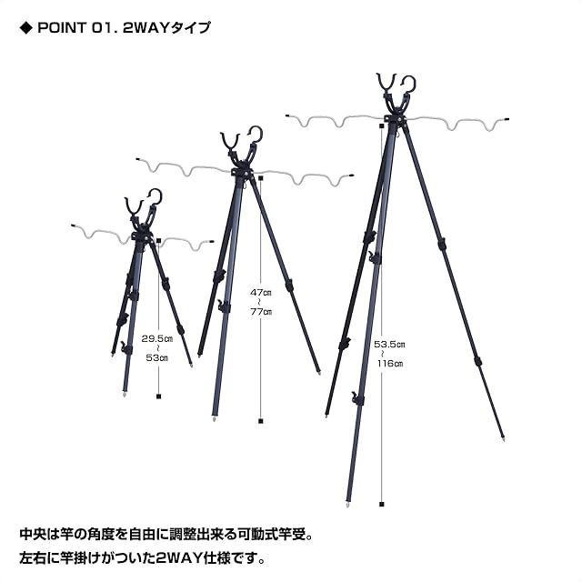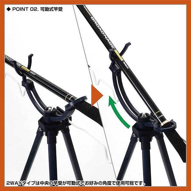 角度調節可能な可動式竿受と竿掛けが付いた2WAY仕様と餌付け器がセット可能なスタンダードの2タイプ。