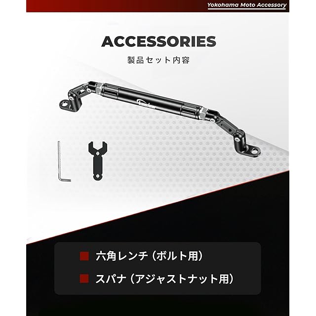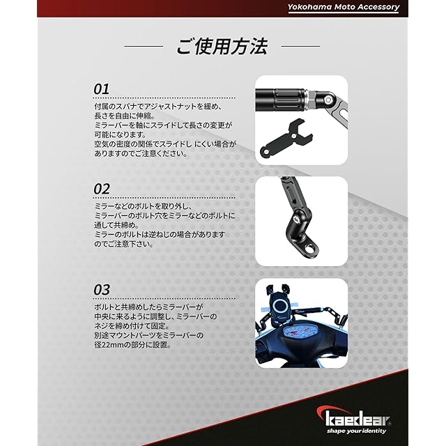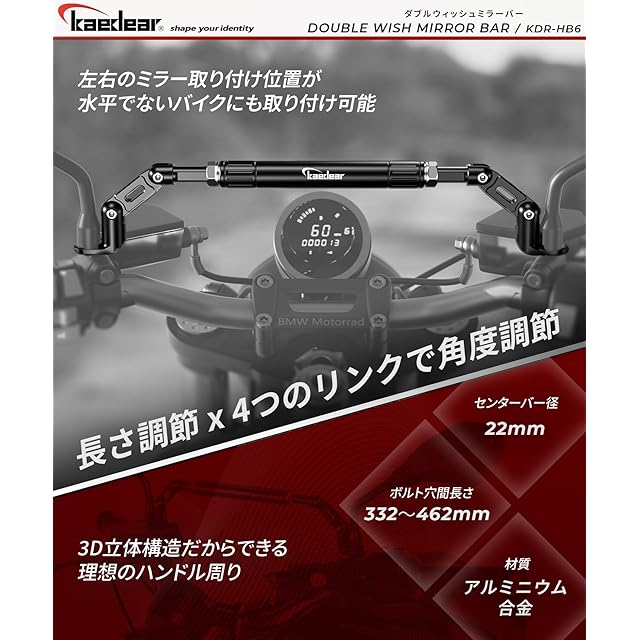 【商品詳細】 ■サイズ:センターバー径22mm、センターバー長さ165mm、長さ調整範囲462mm~332mm、穴径10mm、穴厚さ5mm、取り付け部長さ42mm ■材質:アルミニウム合金 ■内容:ダブルウィッシュミラーバー一式、調整用スパナ、六角レンチ ■取扱説明書(オンラインのみ):環境負荷の軽減を目指した脱炭素化への取り組みとして、紙媒体での同封を控えさせていただいております。Kaedear公式サイトの各商品ページから閲覧またはダウンロードが可能です。 ※ミラー接合部がカウルやリザーブタンクなどの障害物に干渉する場合はミラーアダプターを別途ご用意ください。