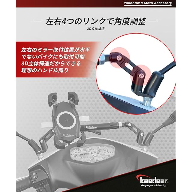 【ダブルウィッシュミラーバー】 スマホホルダーなどのアクセサリー類の増加によりカウルにハンドルが覆われたスクーターは取り付けるスペースに悩まされます。左右でミラーの角度が異なる車種が多く、ミラーとミラーを結ぶマルチバーを取り付けるには車種専用パーツもしくはステーを加工して取り付ける必要がありました。長さの調整だけでなく、四ヶ所のリンクを設けることで左右で角度の異なるミラーに対してもそのまま取り付けが可能となりました。