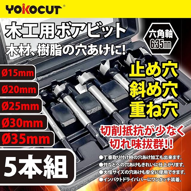 YOKOCUT 木工用ドリル 5本組 座グリビット ボアビット ドリルビット 六角軸【日式6.35mm六角柄で電動ドリルに対応】電気ドリル・充電ドリルドライバー・充電インパクトドライバーに適合する日式6.35mm六角柄を採用しています。取り付けやすく、安定した回転を実現します。 【超硬チップで正確に穴あけ】真ん中の超硬チップが物体に固定され、丸い縁のガイドに従って、任意の方向に丸い穴を開けます。効率的なパンチングを行い、作業時間を短縮します。 【高炭素鋼材質で耐久性と切れ味を両立】高炭素鋼の素材を使用し、熱処理を施しています。製品の加工性能が良く、強度と靭性が高いです。刃を研磨した後も切れ味が鋭く、品質が安定しています。 【5つのサイズで多様な穴あけが可能】15mm、20mm、25mm、30mm、35mmの5つのサイズがセットになっており、木材の止め穴・斜め穴・重ね穴あけ作業に対応します。木材だけでなく、竹、プラスチック、樹脂、アクリルなどにも使用できます。 【鋭い歯とコバルトめっきで高品質な穴あけ】歯のデザインにより摩擦と熱が効果的に低減され、きれいで滑らかでバリのない穴が得られます。表面にコバルトをめっきすることで、ドリルの熱放散性を高め、使用寿命を延ばします。 【防錆油と環境に優しい包装】ドリルは専門的な処理を受けており、乾性防錆油を塗布しています。包装は環境に優しいプラスチック素材を使用しています。 木工用ドリル 座グリビット 座ぐりドリル フォスナービット ドリルビット 木工 竹用ドリル 穴開けドリル ドリルビット セット ボアビット ドリルビット 六角軸 インパクトドライバー ドリルビット