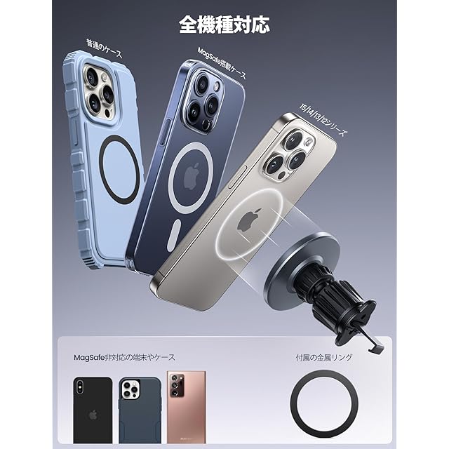 【全機種対応】iPhone 2024, iPhone 16/16Plus/16pro/16pro max/iPhone 15/15 Plus/15 Pro/15 Pro Max/14/14 Plus/14 Pro/14 Pro Max/13/13 mini/13 Pro/13 Pro Max/12/12mini/12Pro/12 Pro Maxの本体やMagSafe搭載ケースに直接装着可能です。付属されたメタルリングを利用すると、磁力がもっと強くなります。Samsung Galaxy, LG, Sony Xperia, HUWEI, XiaomiなどのAndroidスマホに、本品は強力な粘着力があるメタルリングが添付されます。AndroidスマホやMagSafe非対応ケースもメタルリングを貼り付けたら、マグネットスマホホルダーを使用できます。メタルリングを利用した場合でもワイヤレス充電できます。