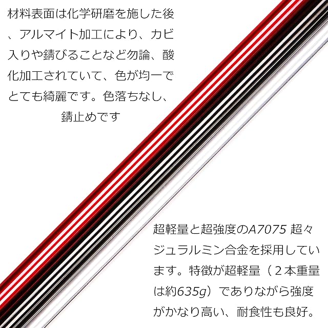 【A7075超々ジュラルミン】超軽量と超強度のA7075 超々ジュラルミン合金を採用しています。特徴が超軽量(2本重量は約635g)でありながら強度がかなり高い、耐食性も良好で、末永く愛用していくことができます。材料表面は化学研磨を施した後、アルマイト加工により、カビ入りや錆びることなど勿論、酸化加工されていて、色が均一でとても綺麗です。色落ちなし、錆止めです。