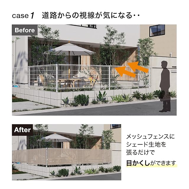 ボタンホール仕様で取付簡単。快適さを損なわない適度な通気性。必要に応じたサイズにカットできる。生地の上下に、等間隔のホールがあります。 シェード生地だから適度な通気性があり、快適さを損なわず、風田によるフェンスへの負荷を軽減します。 生地をカットする際、縦向きにカットしてください。 カットした生地の端は補強のため、 2回折り込み、付属の結束バンドを用いて取り付けてください。境界フェンスはもちろんバルコニーフェンスにも隣家との境界の間仕切りに付属の結束バンドでホールに等間隔で固定。 目安として、約30cm間隔で取り付けてください。