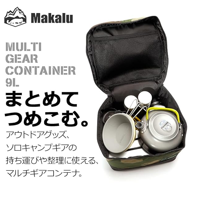 <br>★Makalu MULTI GEAR CONTAINER 9L<br> <br>アウトドアグッズ、キャンプギアの持ち運びや整理に使える、マルチギアコンテナです。<br> <br>人気のコベアキューブがシンデレラフィットします!<br> <br>メスティン ライスクッカー クッカー CB缶 OD缶 小型のコンロ KOVEA CUBE SOTO お弁当箱 ランチボックス 色々な用途に使えるとても便利なサイズです。<br> <br>・内部に汎用性のあるメッシュポケット付<br> <br>・全面保護パッド入りで内部のギアをしっかり保護。<br> <br>・底部には汚れを落としやすく耐久性のあるターポリン素材を使用。<br>