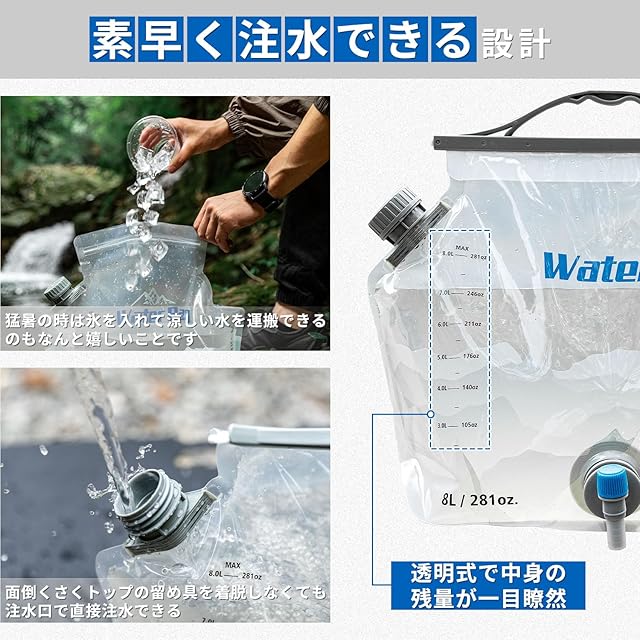折り畳み式&多用途:8Lの大容量、2点セットで、ソロキャンプはもちろん、ファミリーの時でも必要な水を一回で入れることができます。コンパクトに折り畳めるし、持ち運びやすい。キャンプは勿論、断水や地震など災害時このウォーターバッグ一つ備えると水確保問題が解決できます。