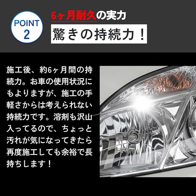 【特徴】ヘッドライト黄ばみクリーナー5つのポイント①お手軽施工②濡れたまま使用可能③炎天下での作業も楽々④ケイ素と研磨剤でWアプローチ⑤耐久性6か月