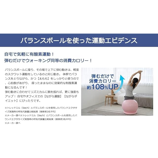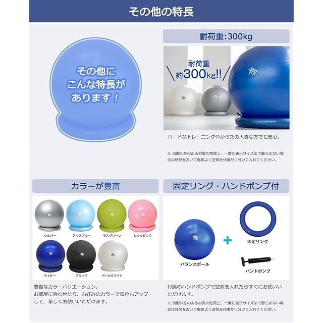 フィットネスクラブを運営しているルネサンスでの、日頃のレッスンやお客様の声を元に、理想のバランスボールを商品化しました。今までなかった固定用リング付きだから、エクササイズに不慣れな方やご年配の方など安全にご使用いただけます。テレビを観る時や、デスクワークの時など、バランスボールに座るだけで、体幹が鍛えられるため、美しい姿勢を保つことができます。また、座りながら跳ねたり、ウエストを揺らしたりすることで骨盤を正しい位置へと導きます。