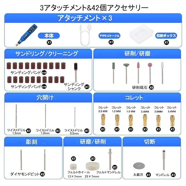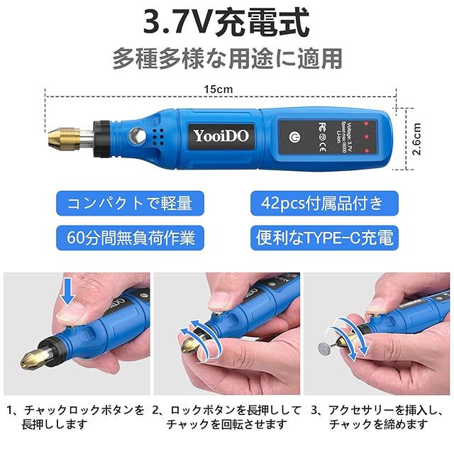 商品名:YooiDO ミニルーター リューター 3.7V 無線ルーター 3段変速 最大16000RPM/Min 42pcsワイヤレスリューター ルーター工具TYPE-C充電式 研磨/彫刻/切削/穴あけ/汚れ落とし/錆落とし/切断/つや出し/ネイルアート DIY軽作業 ミニ工具セット 電動ルーター 充電式りゅーたー (ブルー)