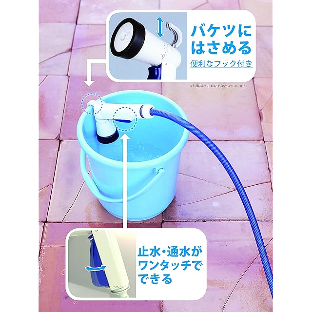 【バケツへの水溜めラクラク】ノズルの上部にひっかけ機能が付いていて、バケツへ固定して水を溜めることができます。