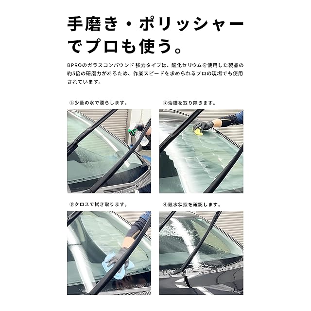 手磨き・ポリッシャー両方に対応:BPROのガラスコンパウンド 強力タイプは、酸化セリウムを使用した製品の約5倍の研磨力があるため、作業スピードを求められるプロの現場でも使用されています。