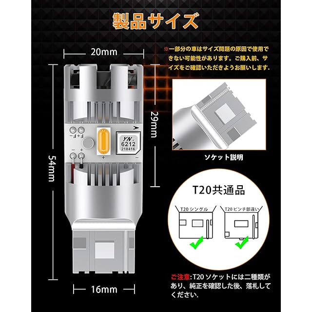 【商品説明&無極性】T20シングル球(ピンチ部違い兼用) LEDウィンカーバルブ、適用ソケット:T20、7440 、W21W。 端子は無極性のデザイン、+極や‐極を注意する必要はなく、簡単に純正球を取り替えます。インストールが簡単であり、初心者でも簡単にインストールを行うことができます。