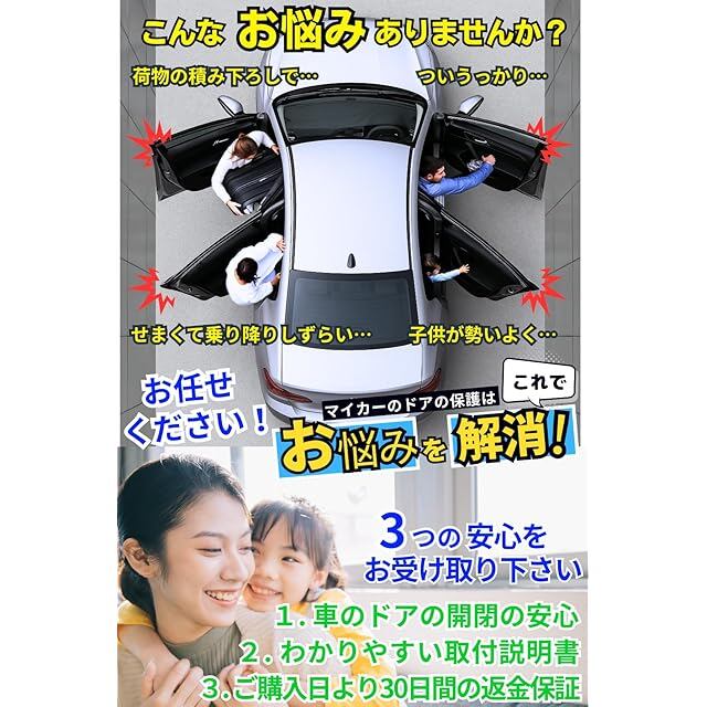 車のドア&ガレージ壁キズ防止 駐車場 クッションの特長 【 車のドアと駐車場の壁のキズ防止 】 軽量で柔らかいシート状の駐車場 クッション材です。お好きな場所に貼るだけなので、セダンやSUVなど様々な車種のドアと車庫の壁の両面をドアパンチから保護できます。 【 9mmの厚さで、耐衝撃性、衝撃吸収性に優れてたクッション材 】 車ドアの開閉時に駐車場の壁にぶつけても衝撃から守り、中程度の激しい衝突によるダメージを防ぎます。 【 壁の長さに合わせてカット可能 】 長さ約2メートルのソフトな素材なので、複数にカットしたり異なる形状にカットすることができ、お好きな長さや場所に合わせて使用できます。 【 強力な粘着力と高い耐久性 】 強力な接着面と網目状メッシュ繊維で、ブロック塀、タイル、レンガ等の壁にもフィットします。( 例:ブロック塀、タイル、レンガ、コンクリート、大理石、金属、ガラス ) 【 表面防水加工 】 特殊な凹凸を施した表面処理により水滴が自然に流れていきやすい構造で、優れた耐水性を実現しています。 【 高品質&環境に配慮した優しいハイエンド素材 】 高密度のEVA素材で、軽さ、柔軟性、耐久性、耐摩耗性などのクオリティーをバランスよく兼ね備えています。 【 絶妙な表面デザイン 】 特殊な凹凸のデザインが装飾となり、ガレージをよりスタイリッシュに彩ります。 【 アンチスクラッチ 】 特殊な表面デザインで、プロテクターシートの傷も最小限に抑え、きれいに保つことができます。
